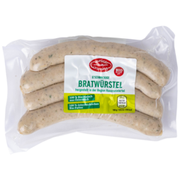 30% BIO-Bratwürstel (97% Schweine- und Rindfleisch**, Speisesalz, Gewürze*, Kräuter*, Dextrose*, Zitronenschalen*, Säureregulator: Natriumcitrate; Schafsdarm)