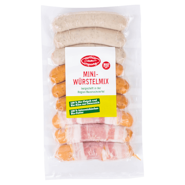 36% BIO-Bernerwürstel (80% BIO-Würstel mit Käse (56% Schweine- und Rindfleisch**, Speck**, 15% Emmentaler-Käse**, Wasser, Kartoffelstärke**, Speisesalz, Magermilchpulver**, Gewürze*, Zucker*, Rote Rübenpulver*, Antioxidationsmittel: Ascorbinsäure; Säureregulator: Natriumcitrat; Konservierungsstoff: Natriumnitrit, Schafdarm), 20% Bacon gegart (Schweinebauch**, Speisesalz, Gewürze*, Dextrose*, Kräuter*, Antioxidationsmittel: Ascorbinsäure, Konservierungsstoff: Natriumnitrit).